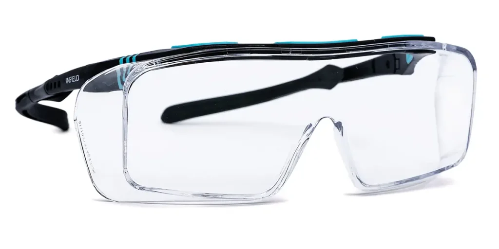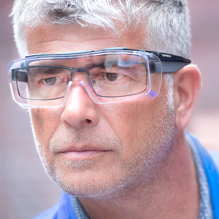 The ONTOR is the perfect over and visitor safety frame. The flexible temple sides that adapt individually to every head shape. The soft rubber pad protects against lateral and frontal impact. Due to the individually adjustable temple side length and the inclination of the lens, ONTOR can be adapted to fit any face shape and work situation.